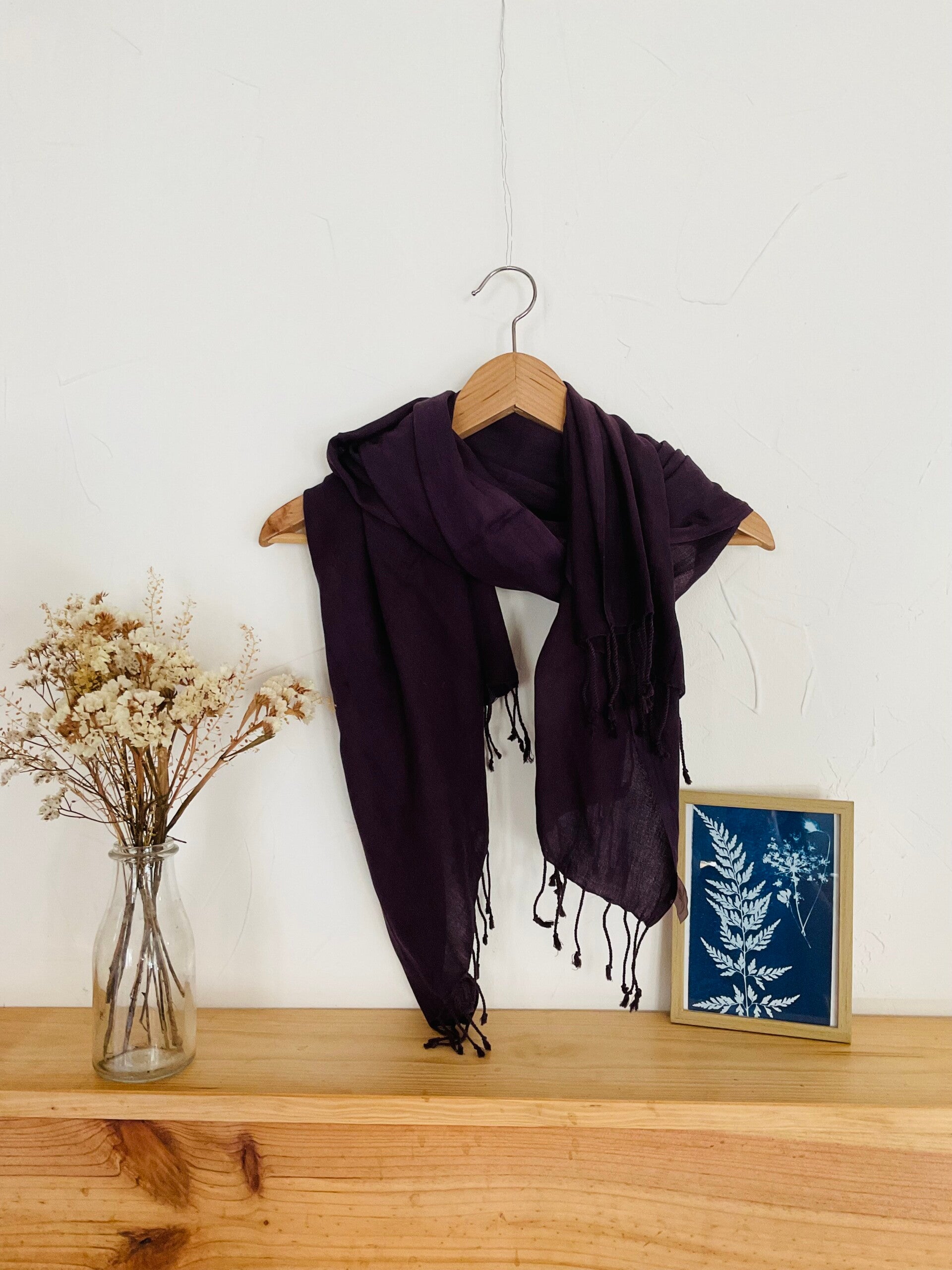 Les teintures sont toutes réalisées de façon artisanale en utilisant uniquement des colorants végétaux et naturels. Les écharpes proviennent de notre partenaire Fibre Bio