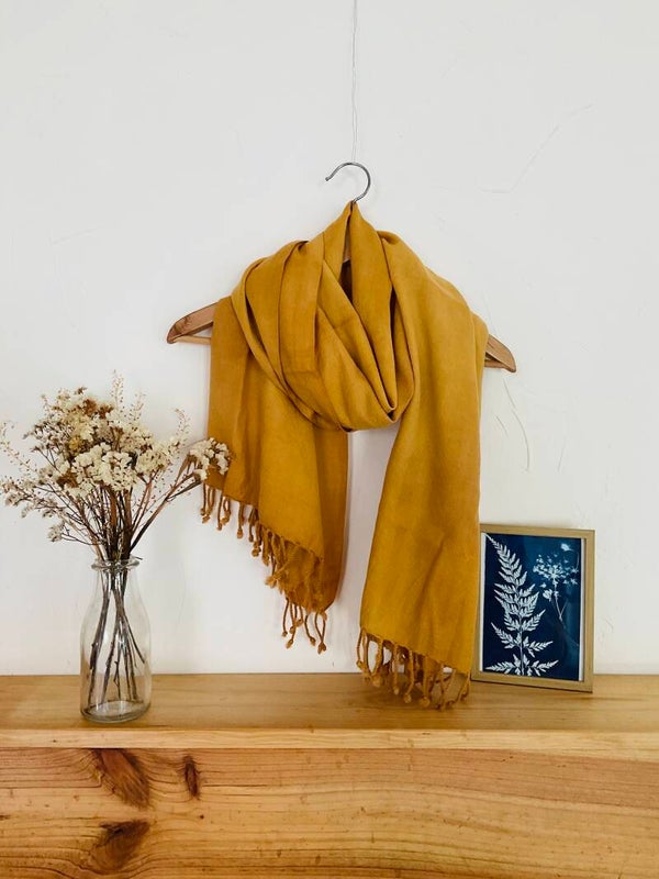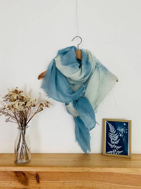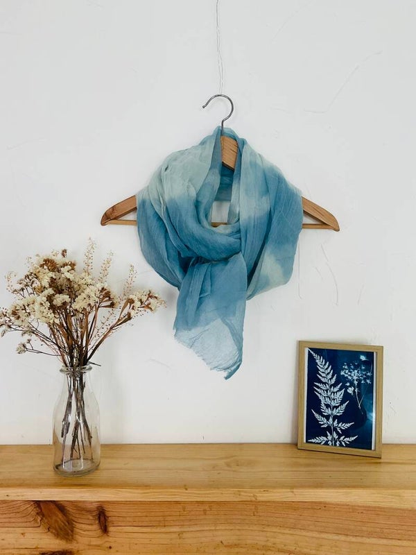 Les teintures sont toutes réalisées de façon artisanale en utilisant uniquement des colorants végétaux et naturels. Les écharpes proviennent de notre partenaire Fibre Bio